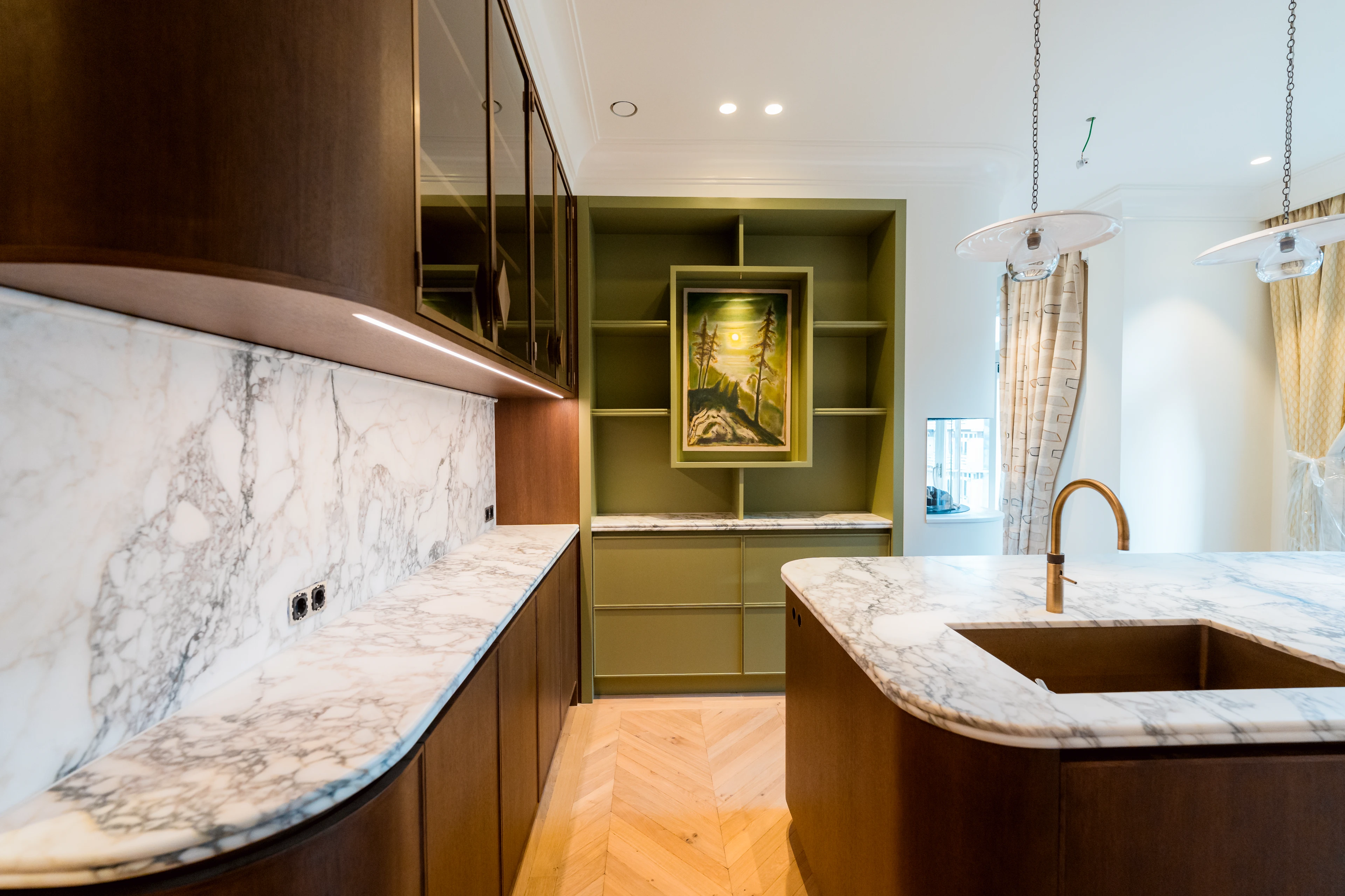 Alle grote installatievlakken zijn meegenomen. Verwarming: herstel en uitbreiding van vloerverwarming plus verplaatsing van cv-installatie en het leveren en plaatsen van een nieuwe ketel. Water- en rioleringswerk zijn opgenomen voor nieuwe indeling en inbouw van badkamers en keukens.