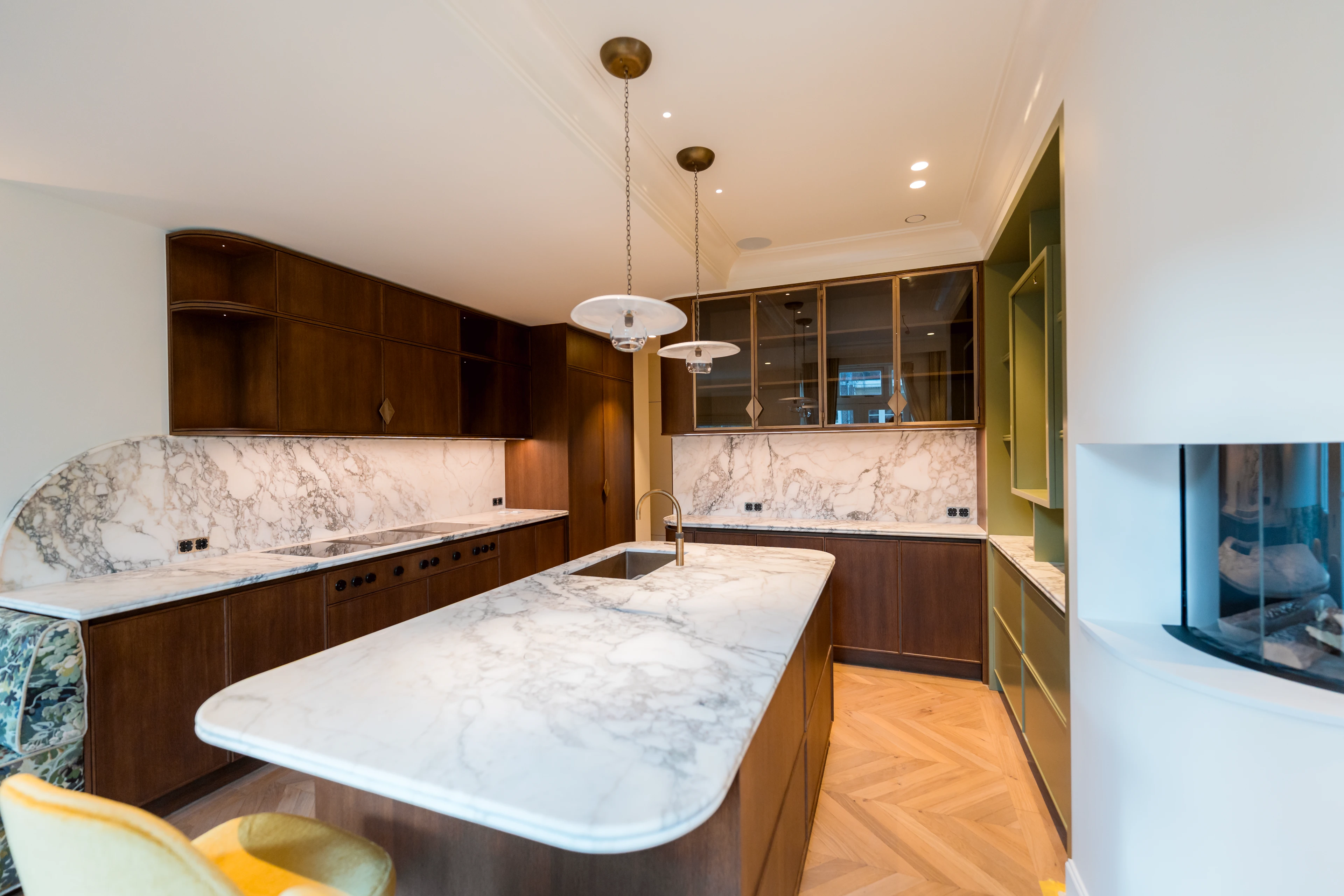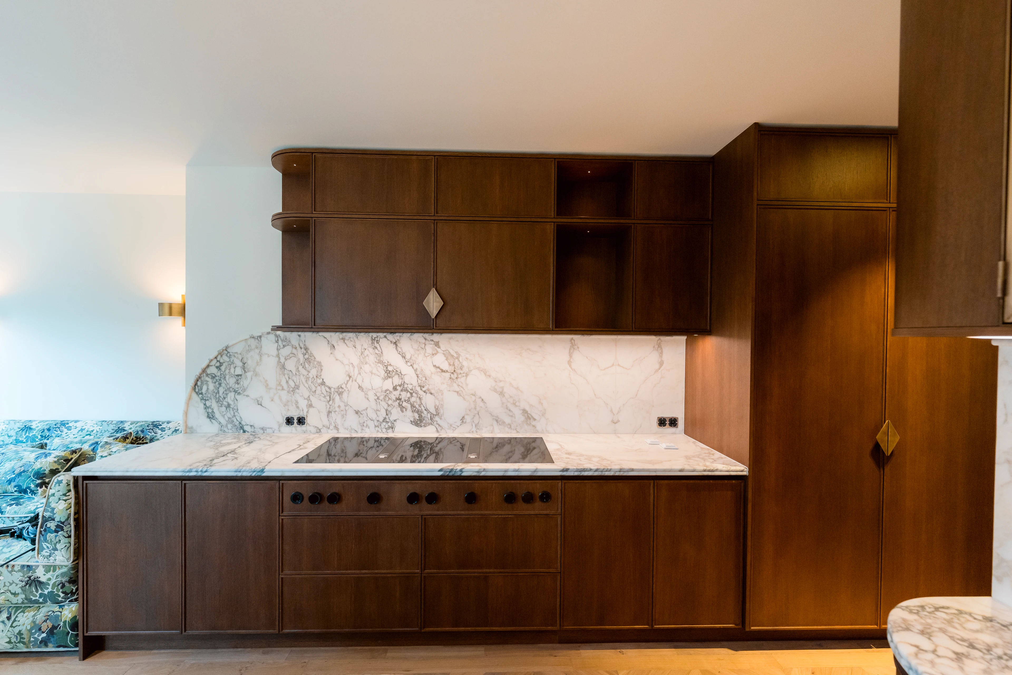 Bestaande muren en nieuwe nisoplossingen zijn voorzien van metselwerk- en timmerwerkdetails. Brandwerende afwerking van stalen profielen komt terug bij het aftimmeren. De offerte houdt rekening met onvoorziene situaties: sommige posten worden pas na sloop vastgezet.