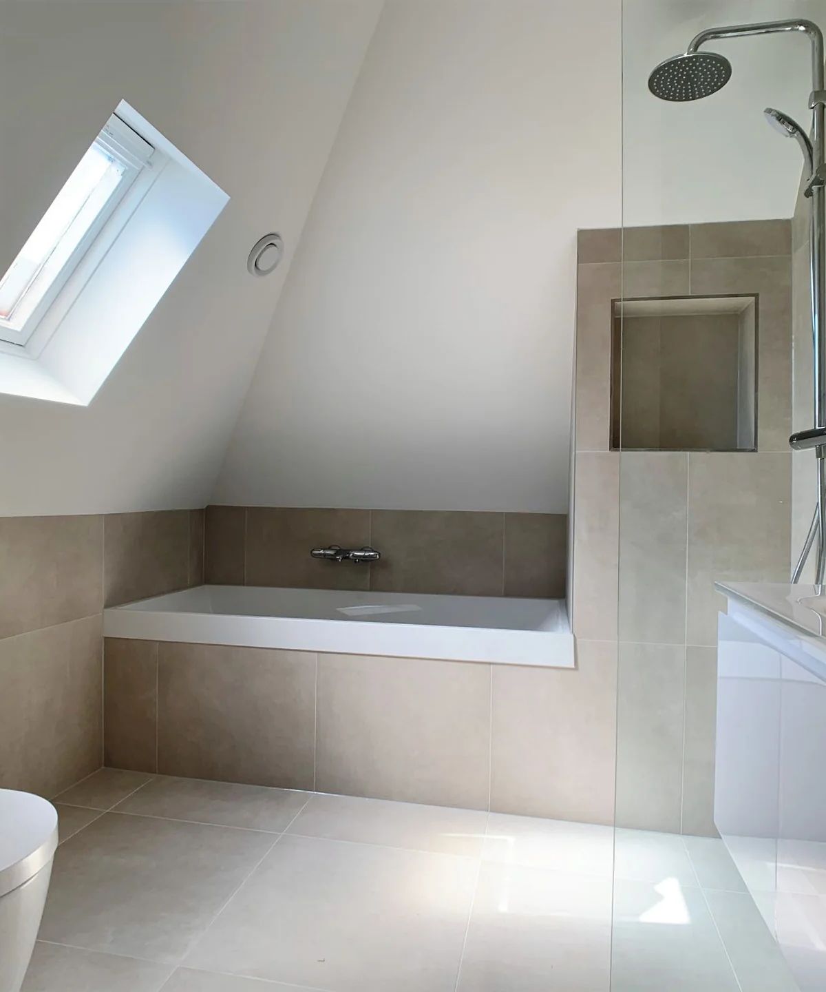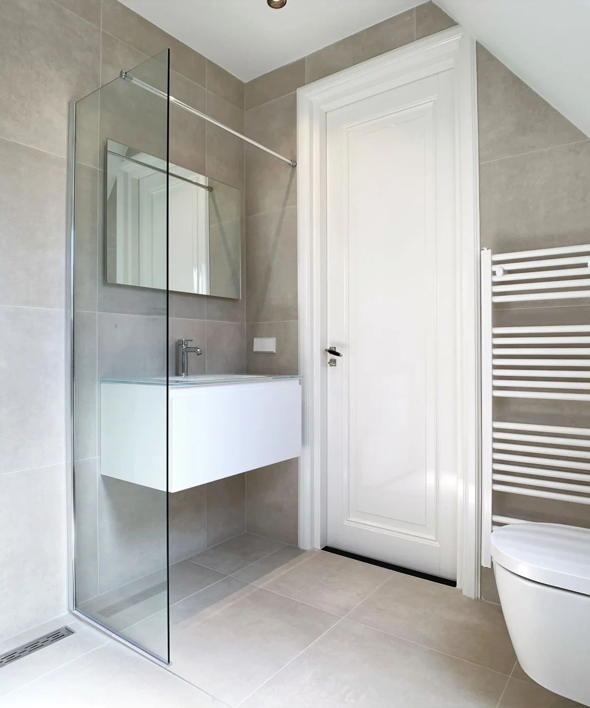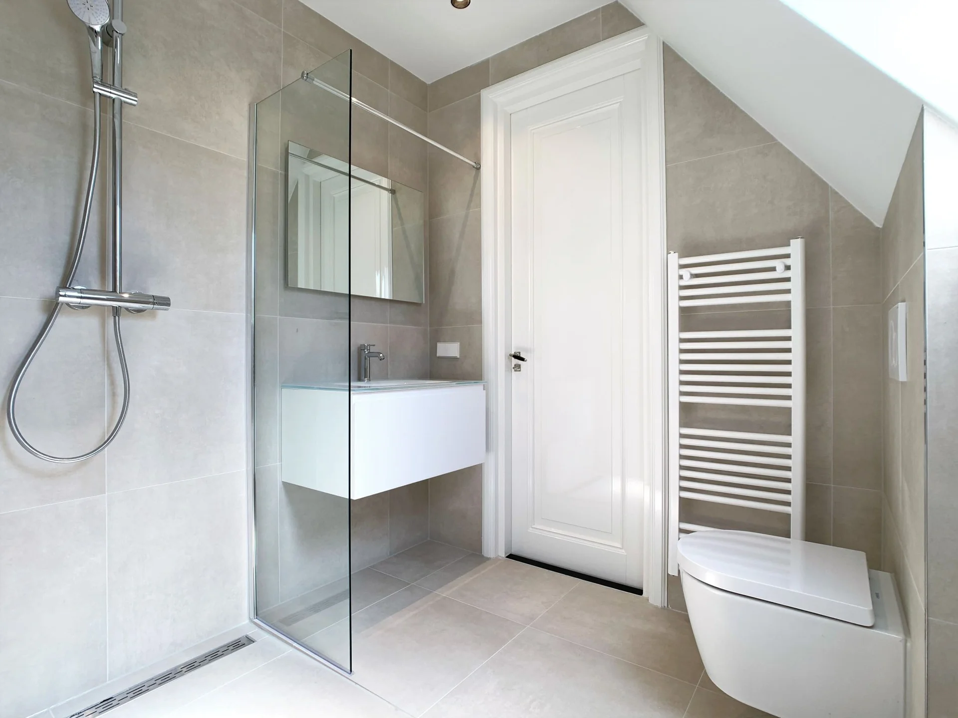 Sanitair en natte delen zijn opgenomen met inbouwreservoir, rvs-afwerkingen en Easydrain-oplossingen. Tegelwerk en stortvloeren in natte ruimten zijn deel van de scope.